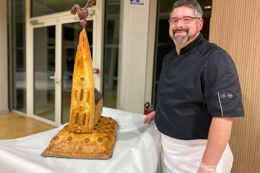 Lors du cocktail offert par l’Association des maires des Deux-Sèvres, à la suite de son assemblée générale, Sébastien Brosseau, charcutier-traiteur à Parthenay, a réalisé une petite œuvre d’art épicurienne. En effet, l’artisan parthenaisien a créé de toute pièce un pâté en croûte représentant l’église Saint-Laurent.
