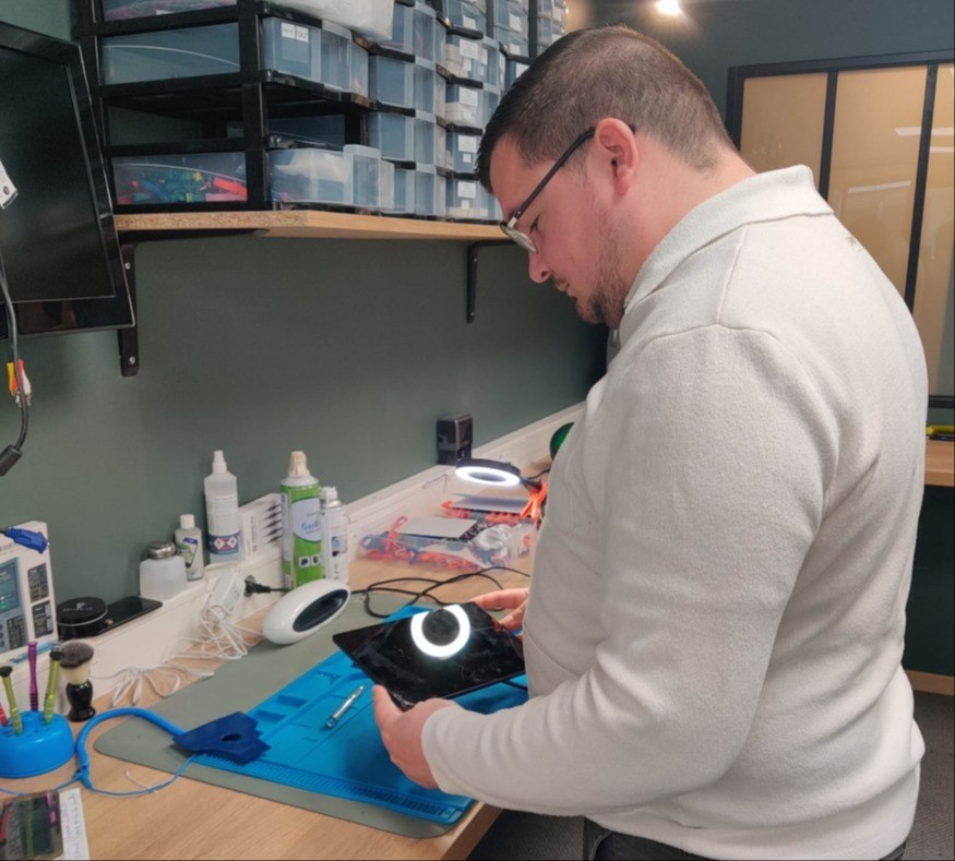 Avec la précision d'un horloger, il ouvre et referme minutieusement tous les appareils électroniques qu'on lui apporte. Il a tout de même accepté de faire une pause pour répondre à quelques-unes de nos questions sur son activité, son entreprise, et ce que le marché de l'occasion et de la réparation dit de la situation des français.