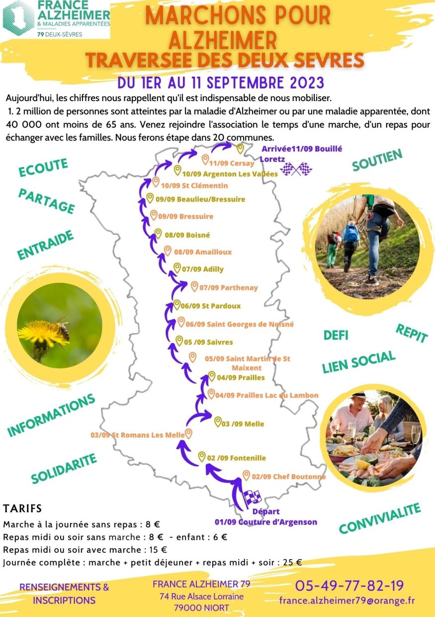 La traversée des Deux-Sèvres de France Alzheimer 79 s’élancera donc le 1er septembre de Couture d’Argenton au Sud, pour rejoindre Bouillé Loretz au Nord le 11 septembre.