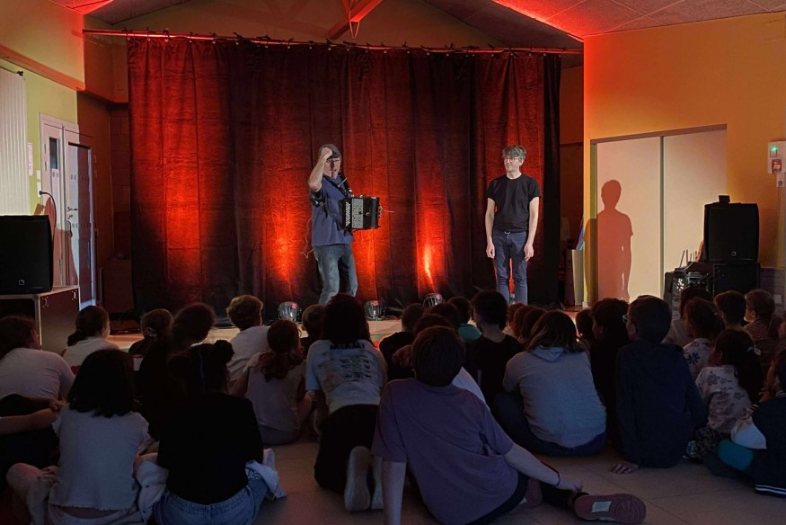 Ce spectacle commence avant tout par des explications. Car oui, si les jeunes écoliers vont écouter un conte en parlanjhe « Dans ce chemin creux… il y avait des petites boules noires… c'étaient des crottes d’Ouailles » explique le narrateur Benoît en contant une petite histoire avant le spectacle. Les enfants réagissent en cœur, sachant pertinemment ce qu’est une Ouaille « Un mouton ! » s’exclament plusieurs d’entre eux. Une fois les explications faites, le spectacle, dirigé par Benoît, du collectif Gonzo et Jakub de l’UPCP Métive, peut commencer au son de l’accordéon. Ils content ensemble une histoire bien connue, celle de la moufle, un conte énumératif d’origine slave ou plusieurs animaux s’amoncellent dans un abri. Mais cette fois, l’histoire est racontée en Parlanjhe ! Et le choix du conte n’est pas un hasard : « Si on a envie d’emmener la langue poitevine et voir ce que savent les gamins, il faut une histoire qu’ils connaissent et qu’on la présente en poitevin » explique Jakub. Une volonté de transmettre la langue de manière amusante « Si on fait quelque chose de ludique autour de cette langue, c’est sûr que ça marche » précise Benoît, qui a répondu à toute notre interview en patois !