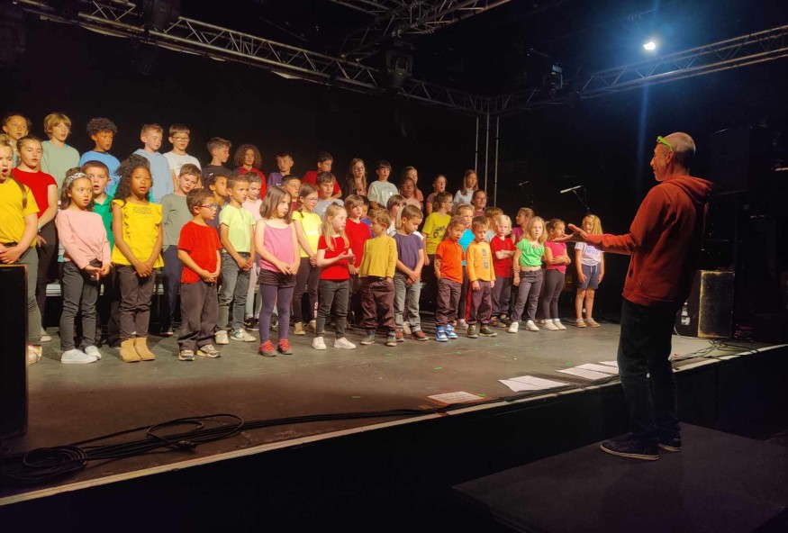 Devant quelques parents pleins de fiertés, la scène de la salle Diff'Art est bondée. 55 élèves de l'école de Ménigoute, de deux classes, regroupant des Grandes Sections, des CP, des CE1 et des CM2 ont passé la journée dans la peau de véritables artistes. "C'est le but de projet comme ça. Les élèves vivent une restitution live comme un artiste professionnel" souffle Lise-Marie Nuaud, chargée de la médiation culturelle à la salle Diff'Art. La salle de musique actuelle est à l'origine de ce projet. "C'est important pour nous de continuer d'aller égrener la musique un peu partout en Gâtine".