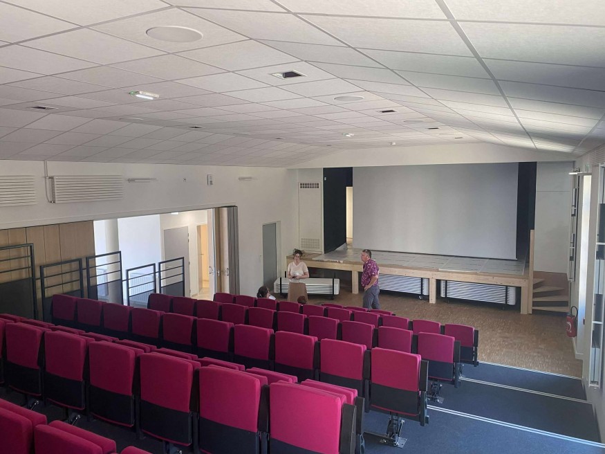 En plus de cette cure de beauté, la salle accueille moult nouveautés « Un écran qui descend de la scène pour faire cinéma, vidéo et visio », explique le maire Pascal Bironneau : « Vous avez des gradins escamotables d’une capacité de 115 places qui se rétractent et se rangent en fond de salle. On a une baie vitrée, qui était précédemment sur châssis fixe, et qui ne l’est plus et s’ouvre pour se transformer en scène extérieure ». La scène intérieure de son côté s’est vue allongée de 70 centimètres, ce qui permet de « donner un meilleur confort sur la scène » pour les acteurs, mais aussi d’offrir des espaces de rangement pour les tables.