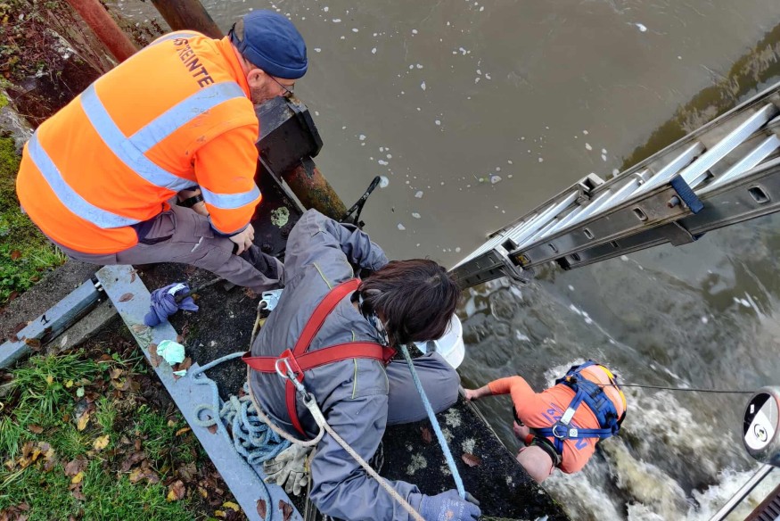 Les services techniques de la ville de Parthenay et l'entreprise MS79 ont réalisé une intervention, ce lundi 8 décembre, sur les pelles hydrauliques au niveau de la passerelle Godineau, à Parthenay.