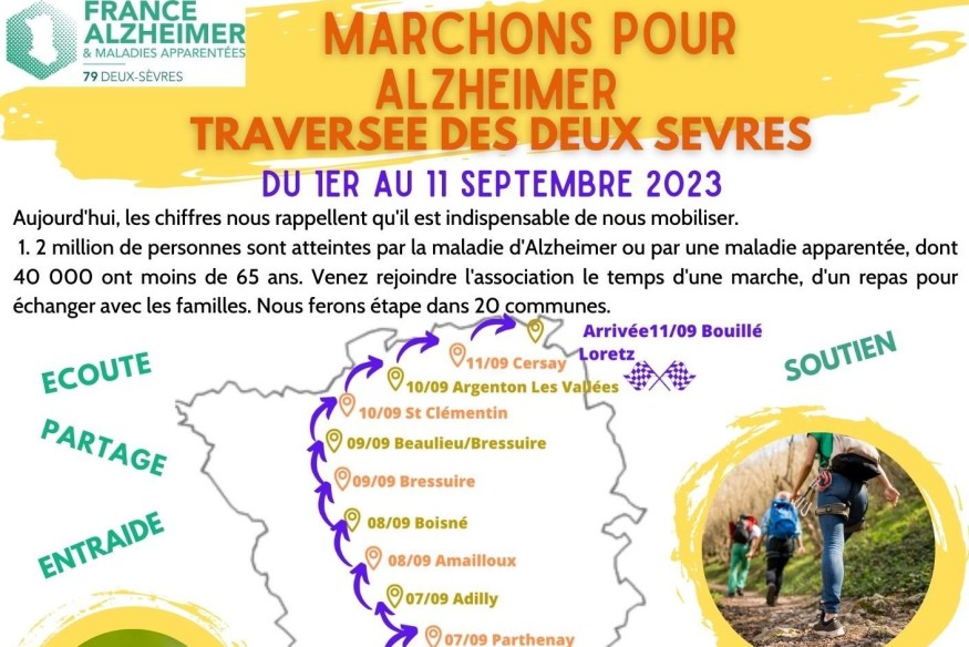 En 2018, France Alzheimer avait organisé un tour des Deux-Sèvres à pied. Les 777 marcheurs avaient parcouru un peu plus de 500 kilomètres, sillonnant tout le département. Cette année, c’est une traversée des Deux-Sèvres qui est au programme. Avec le même objectif. Allez à la rencontre des gens atteints de cette maladie, mais pas que, l’idée, c’est aussi d’informer en s’arrêtant dans plusieurs communes. Avec ce nouvel itinéraire, France Alzheimer souhaite toucher un maximum de personnes. Jacques Poussard, président de France Alzheimer 79,......