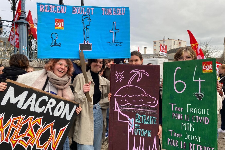 Ce mardi à Parthenay, les manifestants étaient plus nombreux que le 19 janvier et les différentes pancartes revendicatives ne manquaient pas pour lutter contre la réforme des retraites. Alors qu'il était à peine 16h, une centaine de manifestants étaient présent place du drapeau. Nous avons rencontré Philippe, il a 57 ans et devait partir à la retraite dans 3 ans. Changement de plan pour lui si la réforme est adopté. Il s'affiche avec une pancarte accrochée sur son torse "La retraite, oui, mais pas dans un cercueil". Nous avons aussi discuté avec Anna, Anna et Evane, toutes les 3......