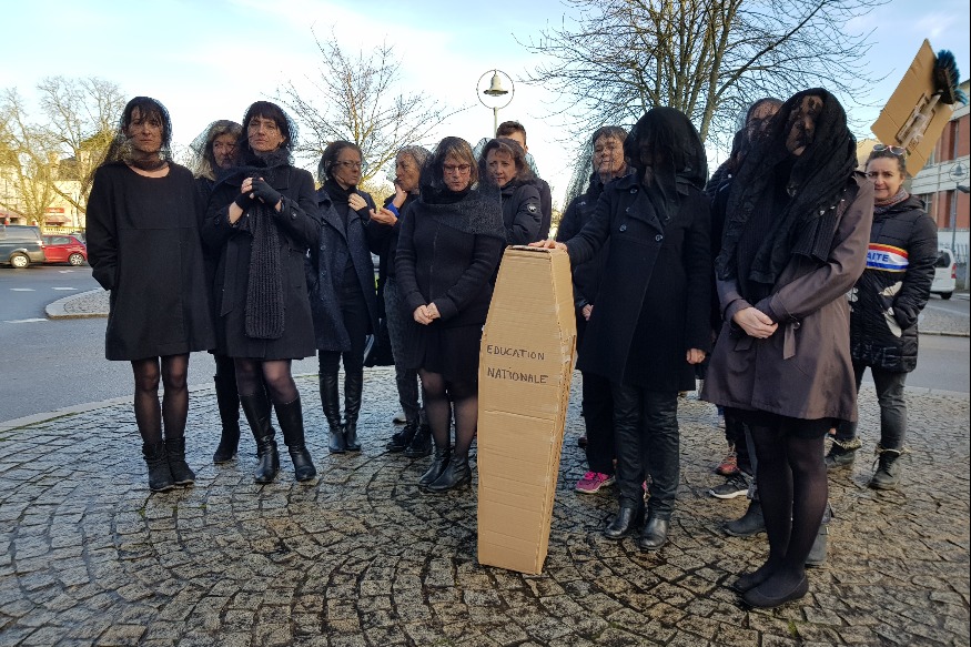 25 professeurs du collège Pierre Mendès-France et du lycée Ernest-Pérochon de Parthenay, mais aussi de l’EREA de Saint-Aubin-le-Cloud, se sont retrouvés hier matin à 10h devant le collège, pour une marche funèbre. En tenue de deuil et avec un cercueil en carton, ils se sont mobilisés pour défendre leur profession qu’ils considèrent en danger et sans avenir pour les jeunes voulant se lancer dans cette voie. Reportage sur place avec Sophie Rossard, professeure d’histoire-géographie, Géraldine Gadé, professeure de maths, et Séverine Ménardeau, conseillère......