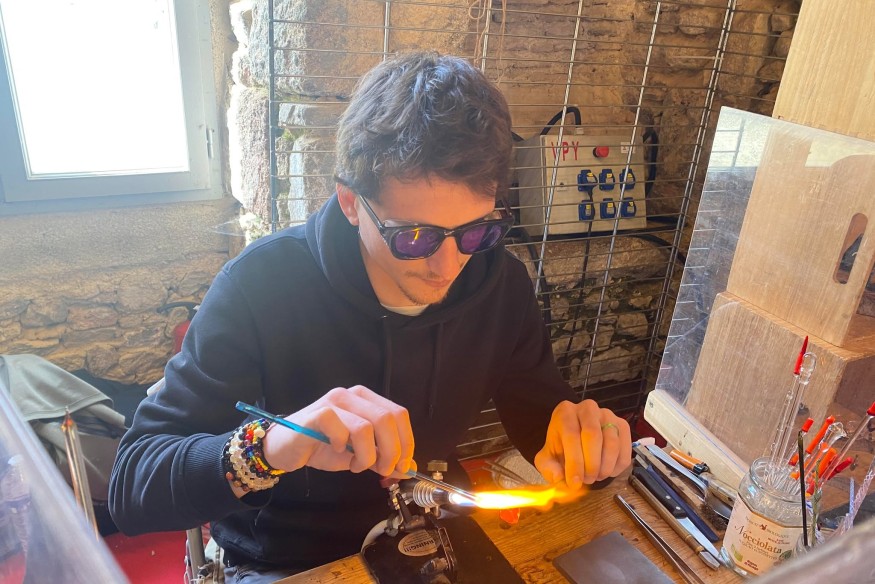 C’est le cas de Quentin, Artiste verrier au chalumeau. Bien installé derrière sa table, un chalumeau allumé et baguette de verre à la main, il manipule la matière avec minutie, bien caché derrière une protection pour éviter de mettre le feu aux cheveux des passants et des curieux.