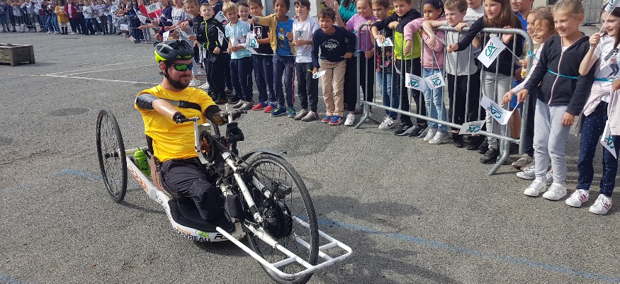 Volonté, courage, abnégation. Voilà trois mots que l’on a beaucoup entendus jeudi dernier dans la cour du collège Saint-Joseph de Parthenay. Ces trois mots, ce sont des qualités indéniables de Franzy Rabin. Ce Niortais de 35 ans a été amputé des quatre membres à la suite d’une méningite foudroyante. Demain, il va partir pour un sacré défi, un tour de France en handbike. Avant le grand départ, Franzy Rabin a fait une étape au collège Saint-Jo, où les élèves massés dans la cour n’ont eu de cesse de l’acclamer et de l’encourager. Le choix de cet établissement n’est pas anodin, puisque pendant trois ans, les collégiens ont participé à un marathon solidaire permettant de récolter pas moins de 17 133 euros pour le projet de Franzy. Ce dernier revient sur le défi qui l’attend à notre micro.
