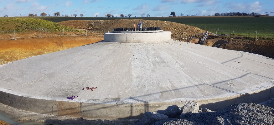 Le futur parc éolien de Saint-Laurs-Beugnon-Thireuil prend du volume. Porté par la société WPD, le coût du chantier s’élève à environ 33 millions d’euros, dont 755 000 ont été récoltés via un financement participatif. Les travaux des six éoliennes ont démarré au mois d’août par la réalisation du réseau de câblage interéolien. En ce début du mois de décembre, le chantier en est au stade du coulage des fondations des six éoliennes qui composeront ce parc. Afin de marquer le coup, WPD a invité mercredi dernier les maires des deux communes, le président de la communauté de communes Val de Gâtine, et les entreprises locales participantes au chantier. L’occasion aussi de célébrer le 500e mégawatt de la société spécialisée dans la construction et l’exploitation de parcs éoliens. Guillaume Wendling, directeur général délégué de WPD, accompagné par Jérémy Bouchez, chef de projets, et Victor Gérard, responsable construction.