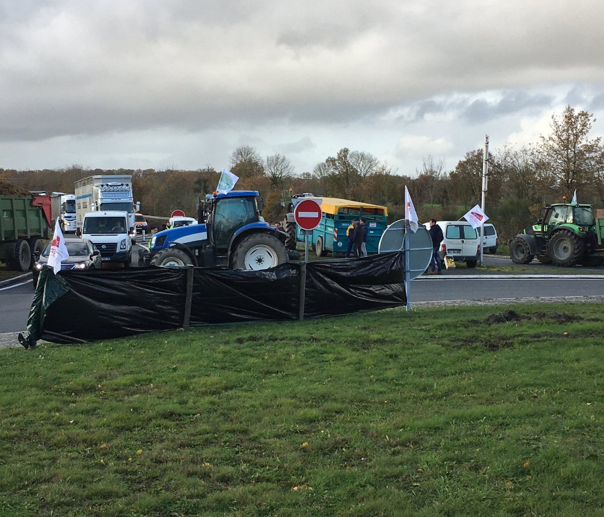 Dans le cadre de la mobilisation nationale de ce mercredi 27 novembre, et notamment l’opération des 1 000 tracteurs à Paris, les syndicats FNSEA et Jeunes agriculteurs des Deux-Sèvres se sont également mobilisés. S’ils n’ont pas pris la route pour monter à la capitale, une centaine d’agriculteurs s’est tout de même postés au rond-point de Poitiers à Parthenay, et à celui de Faye-l’Abbesse à Bressuire, pendant une bonne partie de l’après-midi, pour filtrer les camions et ainsi contrôler la provenance des produits. Les explications d’Alain Chabauty, président de la FNSEA 79.