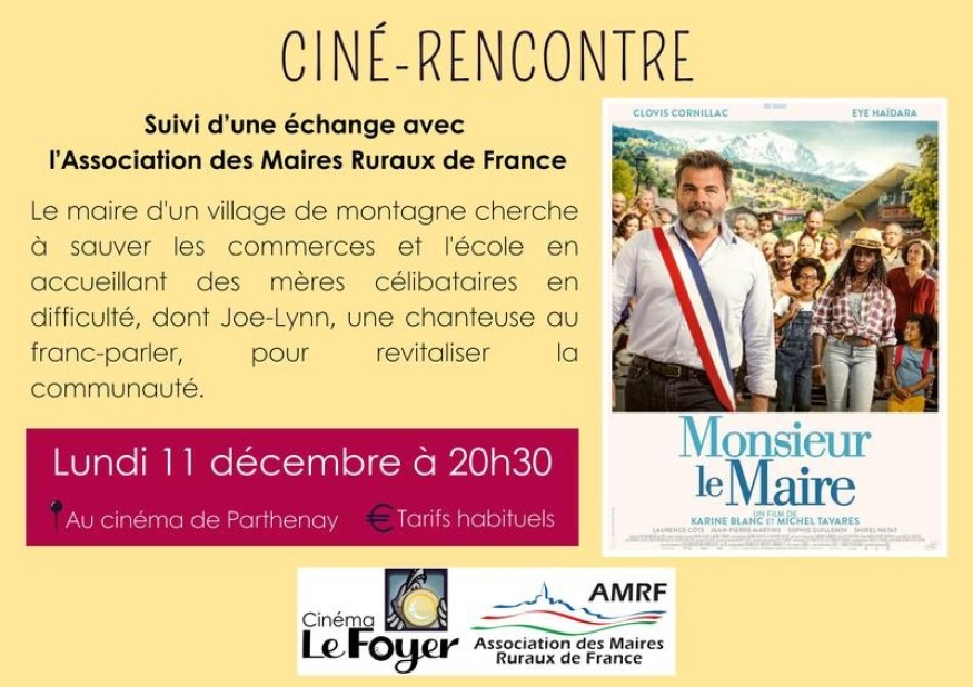 Rendez-vous ce lundi soir 20 h 30, au cinéma le Foyer de Parthenay. Rappelons qu'à l’issue de la séance, un temps d'échange sera animé par Pascal Bironneau 1er vice-président de l'association des Maires Ruraux des Deux-Sèvres. Le public pourra notamment en profiter pour échanger avec les élus sur leurs rôles, sur leurs responsabilités, ou encore leurs droits. Tarifs habituels : 7,80 € et 6,30 € Pus d'infos sur le site cineparthenay.fr