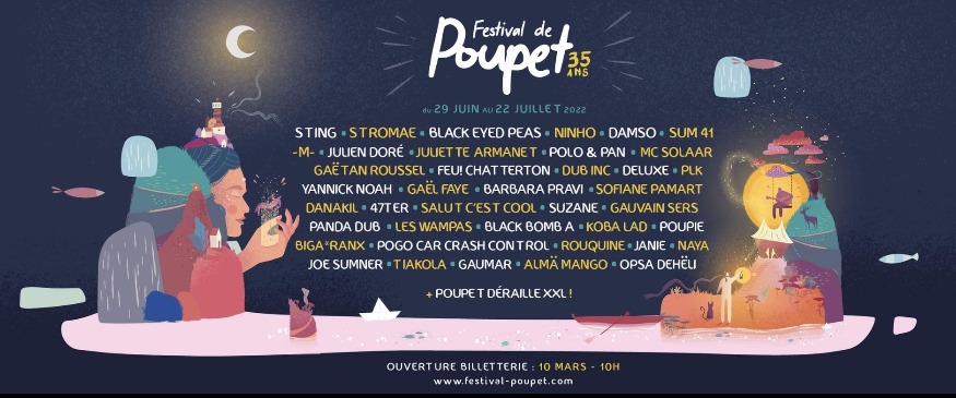 L’équipe du Festival de Poupet a dévoilé ce jeudi l’ensemble de sa programmation pour la 35e édition, qui se tiendra du 29 juin au 22 juillet prochain. En plus des soirées déjà annoncées avec Sting, Stromae, la jeune scène du rap français et Yannick Noah, s’ajoutent dix autres soirées au cours desquelles le public pourra applaudir pêle-mêle, MC Solaar, Sum 41, Juliette Armanet, Julien Doré, Barbara Pravi, M, Gaëtan Roussel, Feu Chatterton, Polo & Pan, Deluxe, les Black Eyed Peas, sans oublier la dernière de Poupet déraille XXL en clôture du festival. On fait le point sur cette cuvée 2022 du Festival de Poupet, en musiques et en paroles avec Jean-Marie Poirier, vice-président du festival. (Crédits photos : visuels Festival de Poupet)