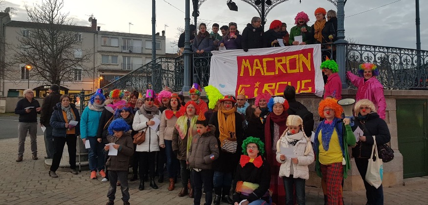 Après une mobilisation sous forme de marche funèbre le 16 janvier dernier, c’est en mode « Macron Circus » qu’une cinquantaine d’enseignants s’est retrouvé vendredi, en fin de journée, au kiosque de la place du Drapeau. Une protestation inter-établissements, alors que le projet de réforme des retraites était présenté vendredi au Conseil des ministres. Dans le cortège, on a retrouvé des enseignants de Parthenay, Saint-Aubin-le-Cloud, voir même de Bressuire, exerçant en primaires, collèges et lycées. Ambiance sur place avec la réaction de Géraldine Gadé, professeure de maths au collège Pierre Mendès-France de Parthenay.