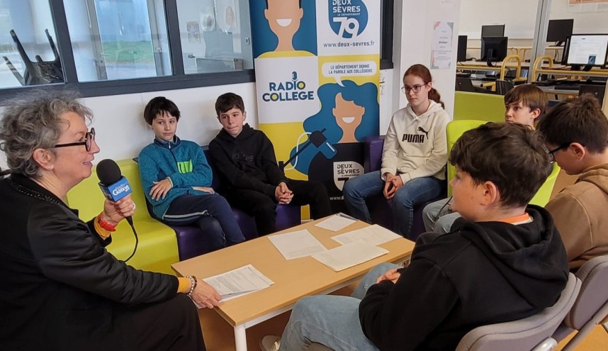 Jeudi dernier (14 ,ovembre), 6 élèves du collège Georges Clemenceau à Cerizay ont enregistré l'émission Radio Collège avec leur invitée Marie-Andrée Guitton, Directrice de la bibliothèque départementale pour évoquer ses missions et l'événement phare de ce mois de novembre, la Semaine de l'enfance, à laquelle elle participe avec ses équipes. Une belle occasion pour Eliot, Maïwen, Benjamin, Ronan, Antonin et Otis de s'exercer à l'interview et questionner leur invitée sur le livre et l'enfant, thème de cette 3e édition.