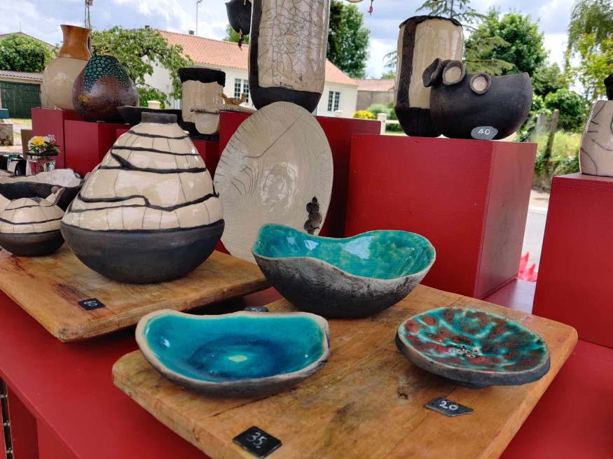 Les techniques utilisées sont, elles aussi, bien différentes. La présidente de Terre à Terre utilise le Raku, une technique inventée en Corée, mais démocratisée au Japon. "À l'origine, c'était utilisé pour faire des tasses pour la cérémonie du Thé" détaille Brigitte Imbert-Labaudinière. "C'est une technique différente puisqu'on va sortir la pièce quand elle est brulante. La pièce passe de 900 degrés à la température ambiante. C'est ce qui provoque les craquelures" caractéristiques de ce procédé de cuisson. À quelques stands, Florence Guilbot utilise une tout autre technique. "Je cuis mes pièces à 1 260 degrés. J'utilise du grès blanc" précise aussi celle qui tient Zomia Ceramics, son atelier à Niort, aux portes du Marais Poitevin. Un environnement qui l'inspire au quotidien." Ce qui fait le lien entre toutes mes collections, ce sont les motifs végétaux." Entre techniques différentes, et inspiration différente, les douze créateurs proposaient des pièces uniques, place de l'Église à Pompaire.