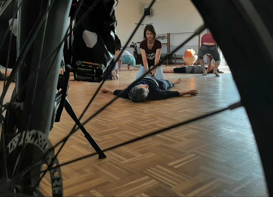 Mercredi matin, la trentaine d’artistes est briefée sur le programme de la journée. Chacun a ses taches attitrées : cuisiner, installer les tivolis ou monter les loges… mais avant de se lancer dans une journée encore bien remplie, une quinzaine de créacyclistes réveillent leur corps avec une danseuse et chorégraphe professionnelle, Fiona Le Goff. "Vous allez être en duo. L'un de vous va s'allonger et l'autre mettra vos muscles en mouvement", guide l'artiste.