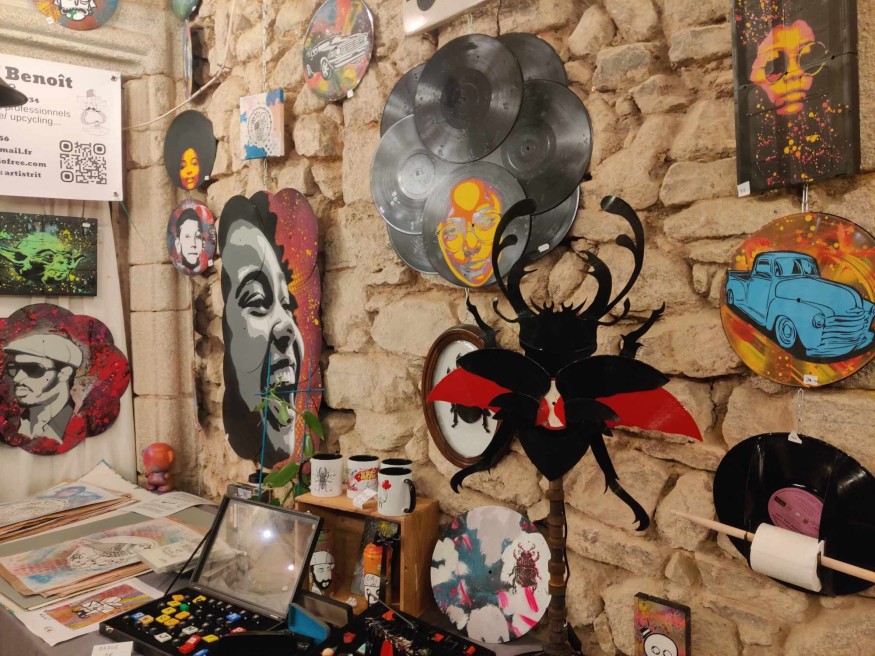Kaloo a confectionné une trentaine de sacs. "C'est 8 à 10 heures de travail pour un sac" précise-t-elle. À quelques mètres, Benoit Savin alias Arti passe aussi par Emmaüs pour récupérer ces disques. Ça lui permet de faire des œuvres abordables, "ça peut permettre à des gens qui n'ont pas forcément une grosse bourse d'avoir de la déco originale".