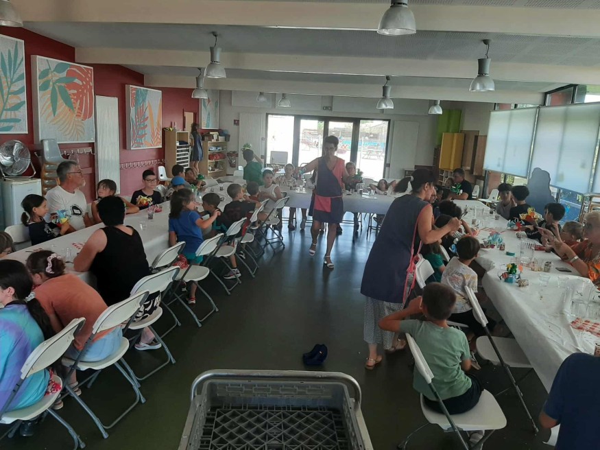 Les élèves entrent dans la cantine où sont déjà attablés les invités du jour. Tables organisées en U, nappes blanches et bouquets de fleurs en papiers. Ambiance banquet pour les élèves du CP au CM2, tous ravis. Tina est en CE2, à côté d’un habitant d’Amailloux, voisin de l’école et elle "adore ! On peut changer de tables alors que d'habitude, on est tout le temps avec les mêmes camarades.", lance-t-elle. Tina discute avec Sylvain, habitant d’Amailloux, voisin de l’école. Il lui parle de ses petits-enfants. "C'est bien, on est en repas intergénérationnel, c'est intéressant."