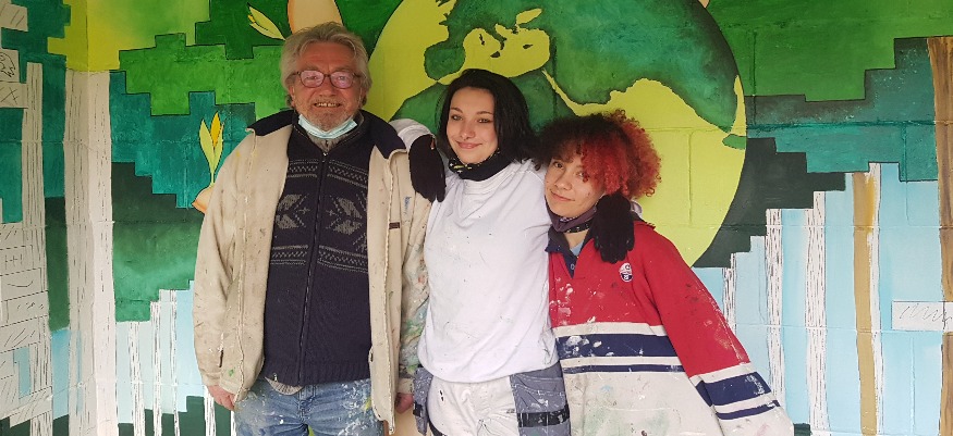 Créé il y a une dizaine d’années dans le parc du château de Coulonges-sur-l’Autize, « Le Coin des ados » est un espace dédié (comme son nom l’indique) aux adolescents de la commune. Véritable lieu d’échanges et de partages, la municipalité a voulu lui redonner un coup de jeune. Pour cela, elle a fait appel à l’artiste-peintre local Alain Simmonet qui, avec l’aide de deux stagiaires, a totalement repensé l’endroit autour de la thématique de l’environnement et du développement durable. Retour sur ce projet avec Audrey Rondard, adjointe en charge de la culture à Coulonges-sur-l’Autize, Alain Simmonet et ses deux stagiaires Lylou et Clémence.