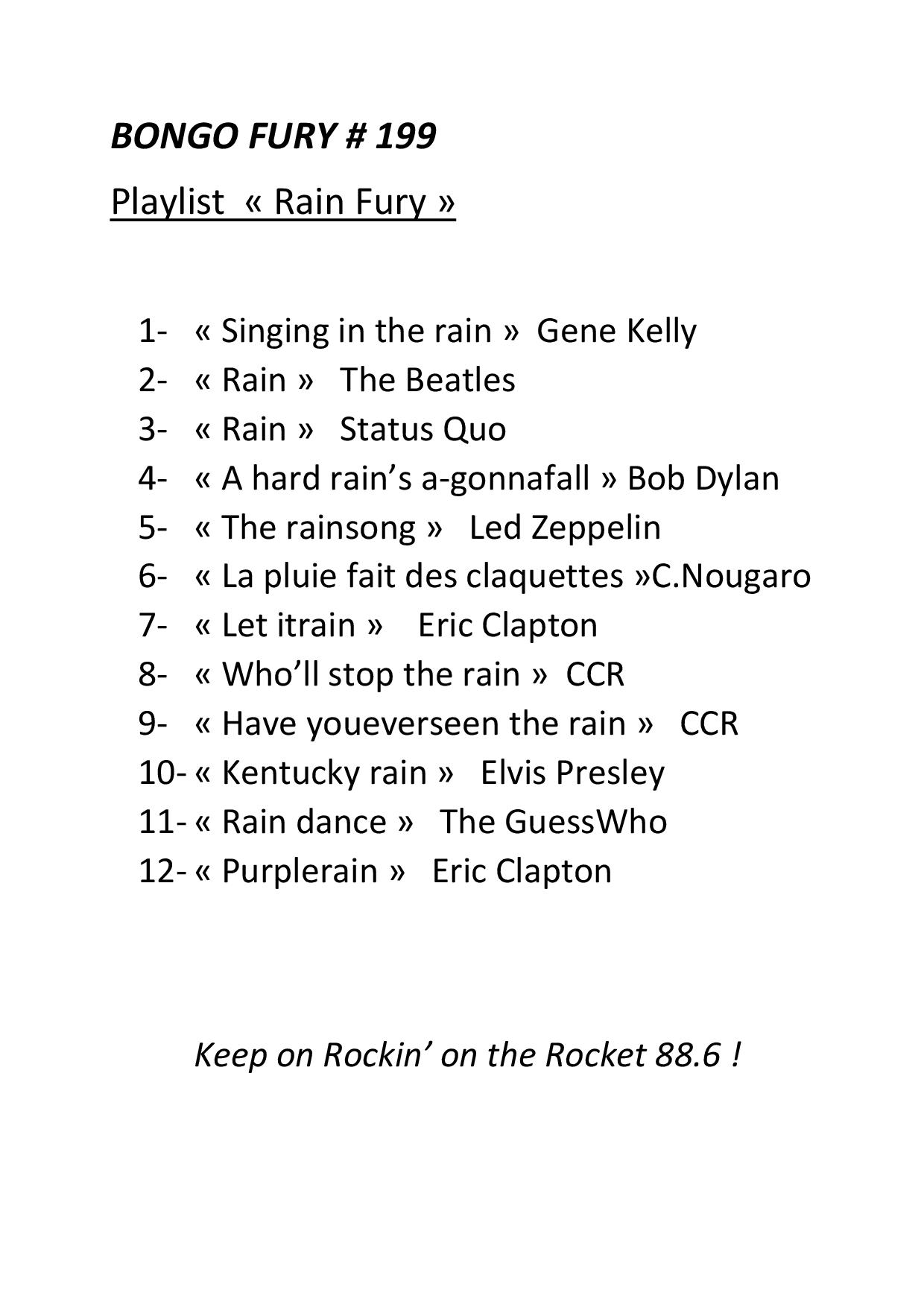 La machine rétro-futuriste Bongo Fury semble inarrêtable sur le «Rocket» 88.6 ! Bongo Fury maintient le cap … et continue son exploration furieuse de la grande épopée du Rock ! L'émission est diffusée sur les ondes depuis janvier 2004.
