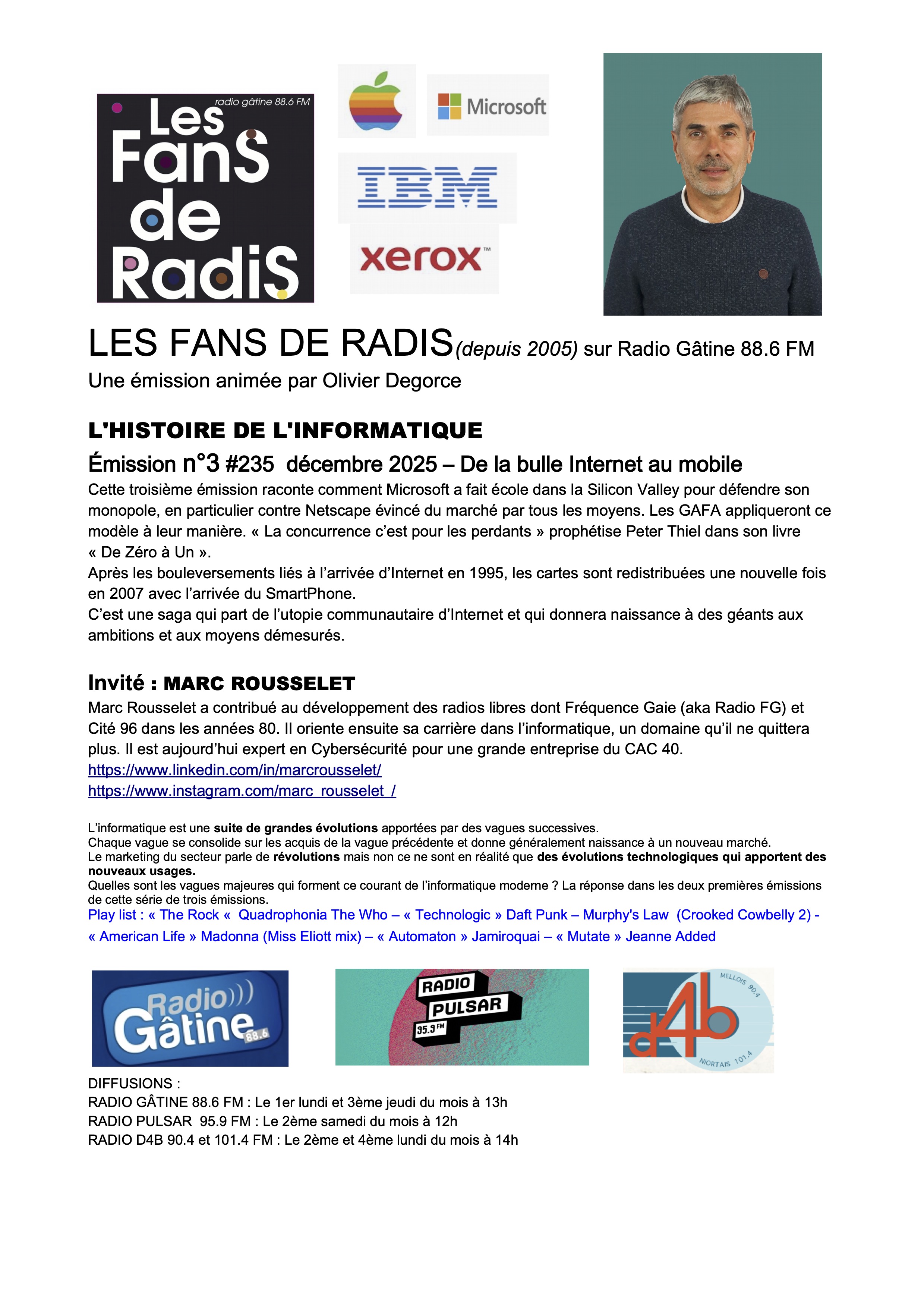 Olivier anime cette émission ouverte à de multiples univers à travers des rencontres avec des auteurs, des éditeurs, des libraires, des disquaires, des associations, des militants ou divers acteurs de la vie locale. Une émission où l’on peut parler de sujets comme la musique, l’écologie, l’alimentation, l’érotisme, les arts plastiques…